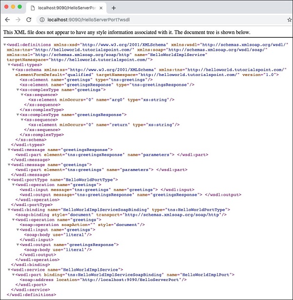 Now, try adding the ?wsdl to your URL and you will see the following output −