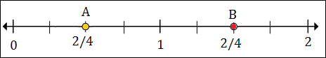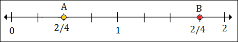 To plot 1$\frac{1}{2}$ or 1$\frac{2}{4}$ we put a point between 1 and 2, 2 marks to the right of 1.