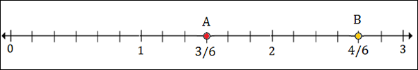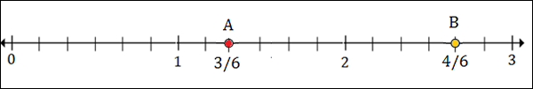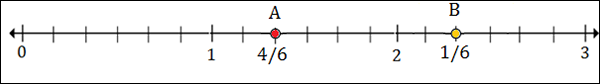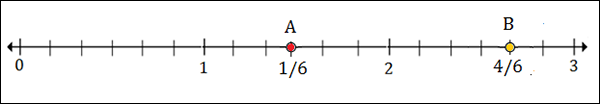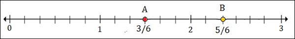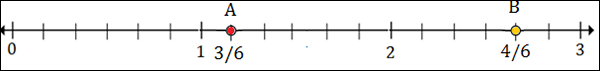 To plot 1$\frac{1}{2}$ or 1$\frac{3}{6}$, we put a point between 1 and 2; 3 marks to the right of 1.