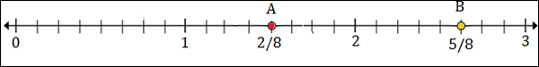 To plot 2$\frac{5}{8}$, we put a point between 2 and 3; 5 marks to the right of 2.