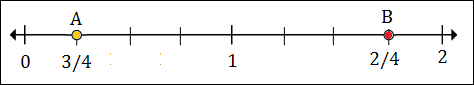 To plot $\frac{3}{4}$, we put a point between 0 and 1, 3 marks to the right of 0.