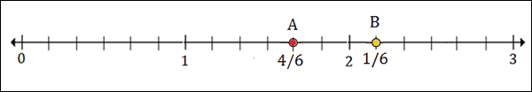 To plot 2$\frac{4}{6}$, we put a point between 2 and 3, 4 marks to the right of 2.