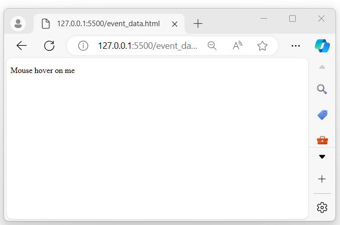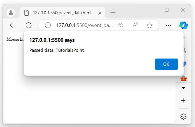 The above program displays a message, and when the mouse pointer hovers over it, a pop-up alert appears on the browser screen showing the data value that was passed to the event handler −