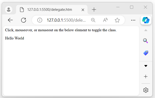 The above program displays a message when the user performs the listed events such as: click, mouseover, or mouseout action. During these actions, the .demo class will be added to the element that triggered the event and removed when the event is no longer active −