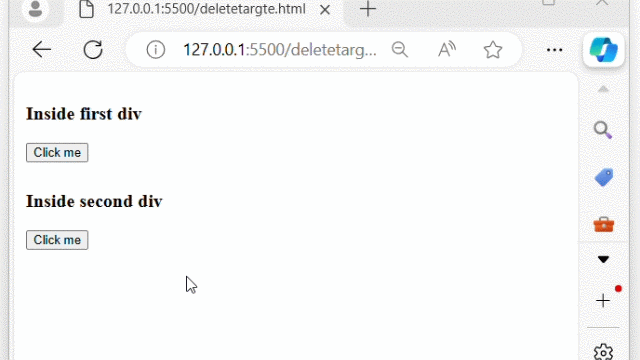 The above program displays two div elements, each containing a "p" and a "button" element. When the button is clicked, the background color of the respective div element will change to green −