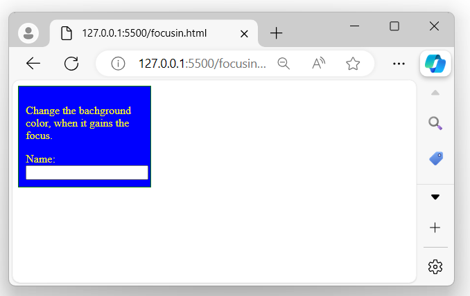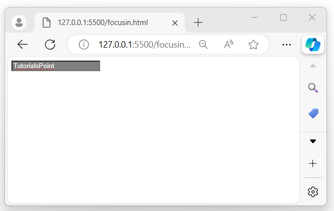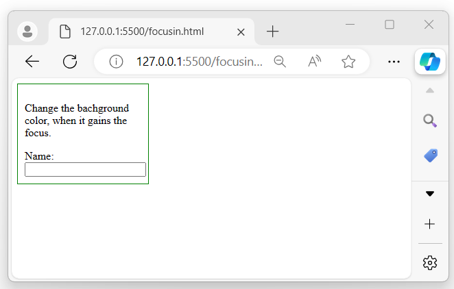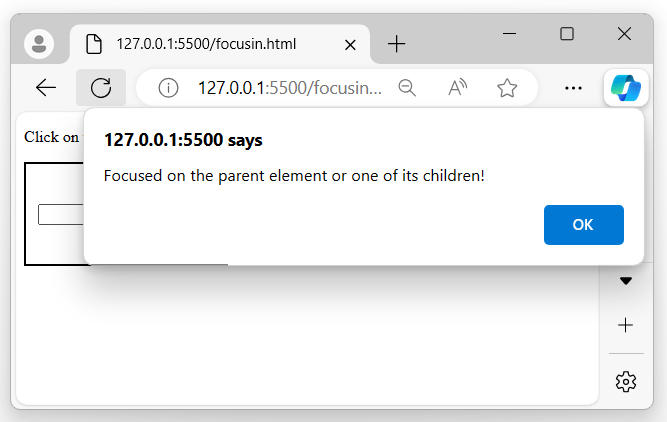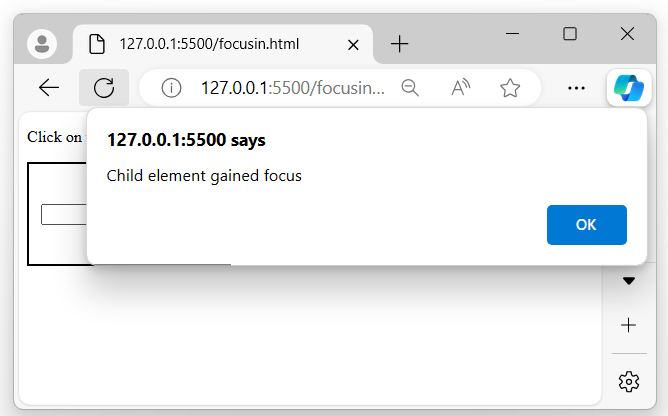 After executing the program, if you focus on the child input element, both focusin() event handlers will be triggered because of event bubbling. First, the child’s handler will run, and then the parent’s, due to the event propagation in the DOM −