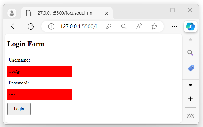After executing the program, a form with two input fields and a button will be displayed. If the length of the entered value is less than 5, the background color of the input fields will turn "red"; otherwise, it will change to "green" −