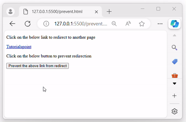 The above program displays a link and a button, when the user clicks on the link will redirect to another page, whereas clicking the button will prevent the link from redirecting −