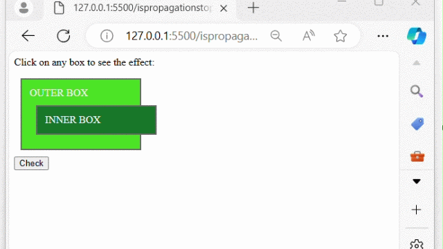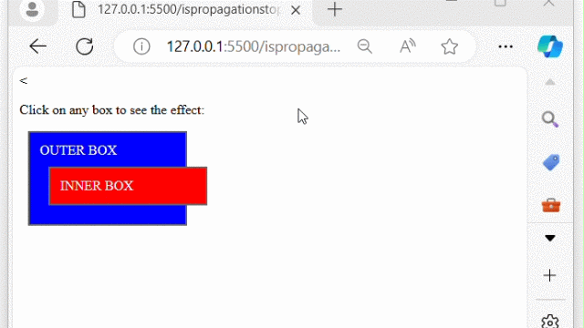The above program displays two nested div elements. When a div is clicked, a pop-up indicates which div was clicked. The pop-up also shows 'true' if event.stopPropagation() was called, indicating that event propagation has been stopped −