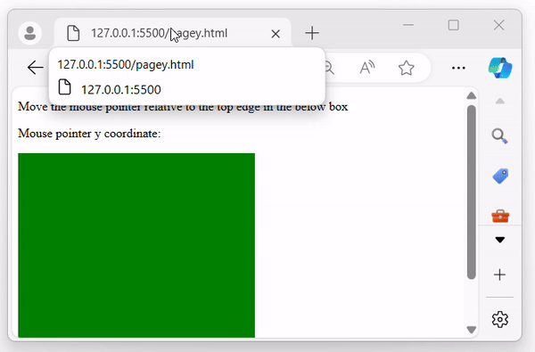 Following is another example of using the jQuery event.pageY property. We use this property to find the Y-coordinates of mouse pointer for a specific area −