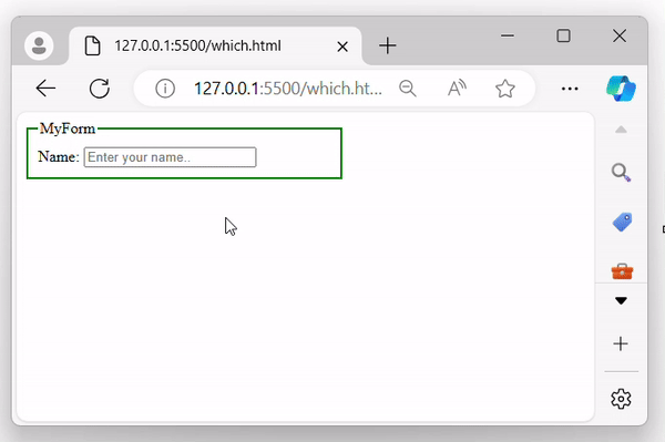After executing the above program it displays a form that has an input, when the user starts entering something within the input the respected pressed key will be displayed next to it −