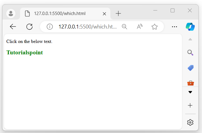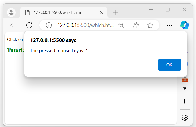 The above program displays a p element having some text, when the mouse pointer clicks on it, a pop-up alert will appear on the browser screen displaying which mouse button you pressed −