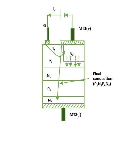 when gate terminal is negative with respect to MT1, gate current flows through P2N3 junction, and reverse biased junction N1P2 is forward biased as in a normal thyristor. As a result, triac starts conducting through P1N1P2N3 layers initially.