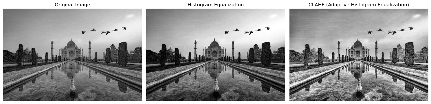 axes[2].set_title('CLAHE (Adaptive Histogram Equalization)')